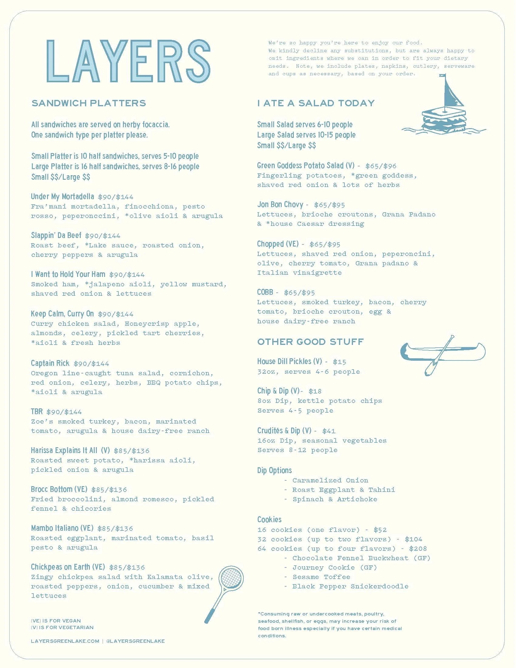 We’d love to cater or host your next celebration! Please fill out the form below and we’ll be in touch to discuss the details. Name * First Name Last Name Email * Phone * (###) ### #### Preferred Date * MM DD YYYY Number OF GUESTS * EVENT DESCRIPTION * Require a private space? * YES PLEASE NO THANKS If you'd prefer offsite catering, we want to confirm that you’re able to pick-up from our shop on Green Lake as we don’t offer delivery at this time. Are you able to pick-up from the shop between 11AM-4PM? ABSOLUTELY! SADLY, NO. What time would be best for you to pick-up between 11AM-4PM? Hour Minute Second AM PM How did you hear of us? * A FRIEND GOOGLE WALKED BY OTHER Thank you! Sample Catering Menu - October through March